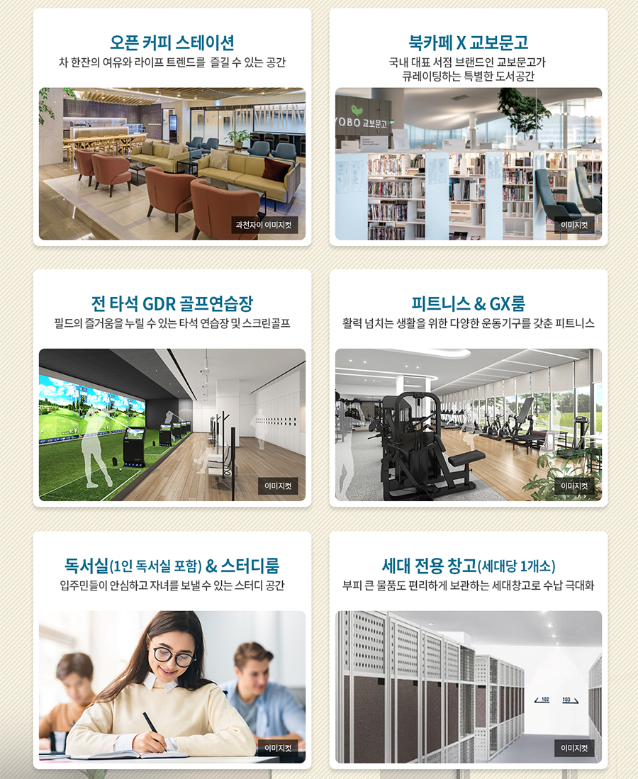 전 타석 GDR이 적용된 골프연습장 및 스크린골프, 피트니스센터, GX룸 등 다양한 시설이 계획되어 있고, 각 동 지하층에는 부피가 큰 짐이나 계절용품을 편리하게 보관할 수 있는 세대창고(세대당 1개소)가 제공될 예정입니다.
