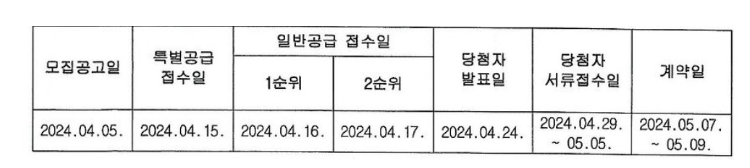 청약일정은 4월 15일 특공, 16일 1순위, 17일 2순위 접수가 있고, 24일에 당첨자발표, 서류접수일은 29일부터 5월 5일, 계약일은 5월 7일부터 5월 9일까지로 예정되어 있습니다.