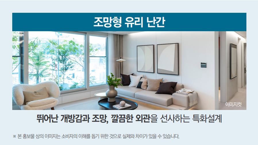 단지의 차별화된 설계를 살펴보겠습니다. 내부는 남향 위주의 단지배치로 채광성과 통풍성이 우수하며, 내부는 전 침실 창호를 전창으로 설계하고 조망형 유리난간을 적용해 특별함을 더했습니다.