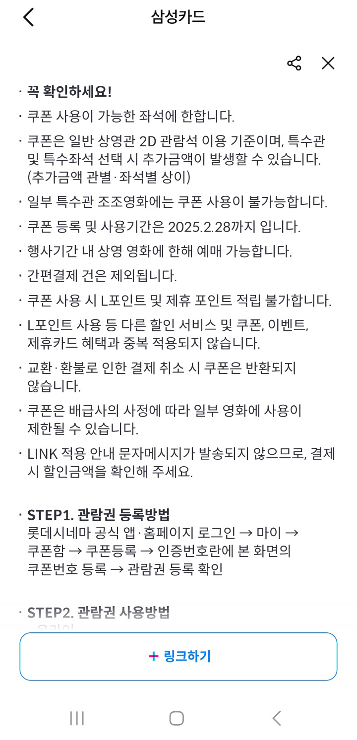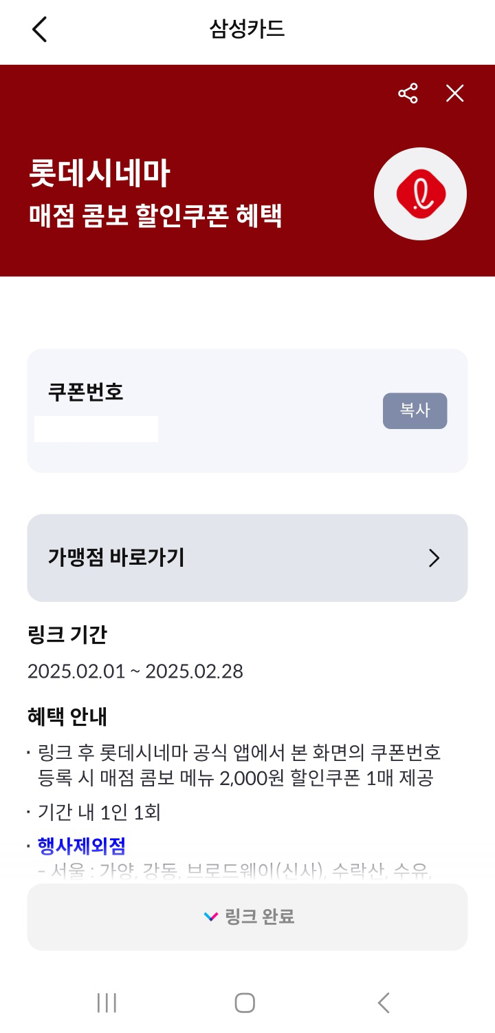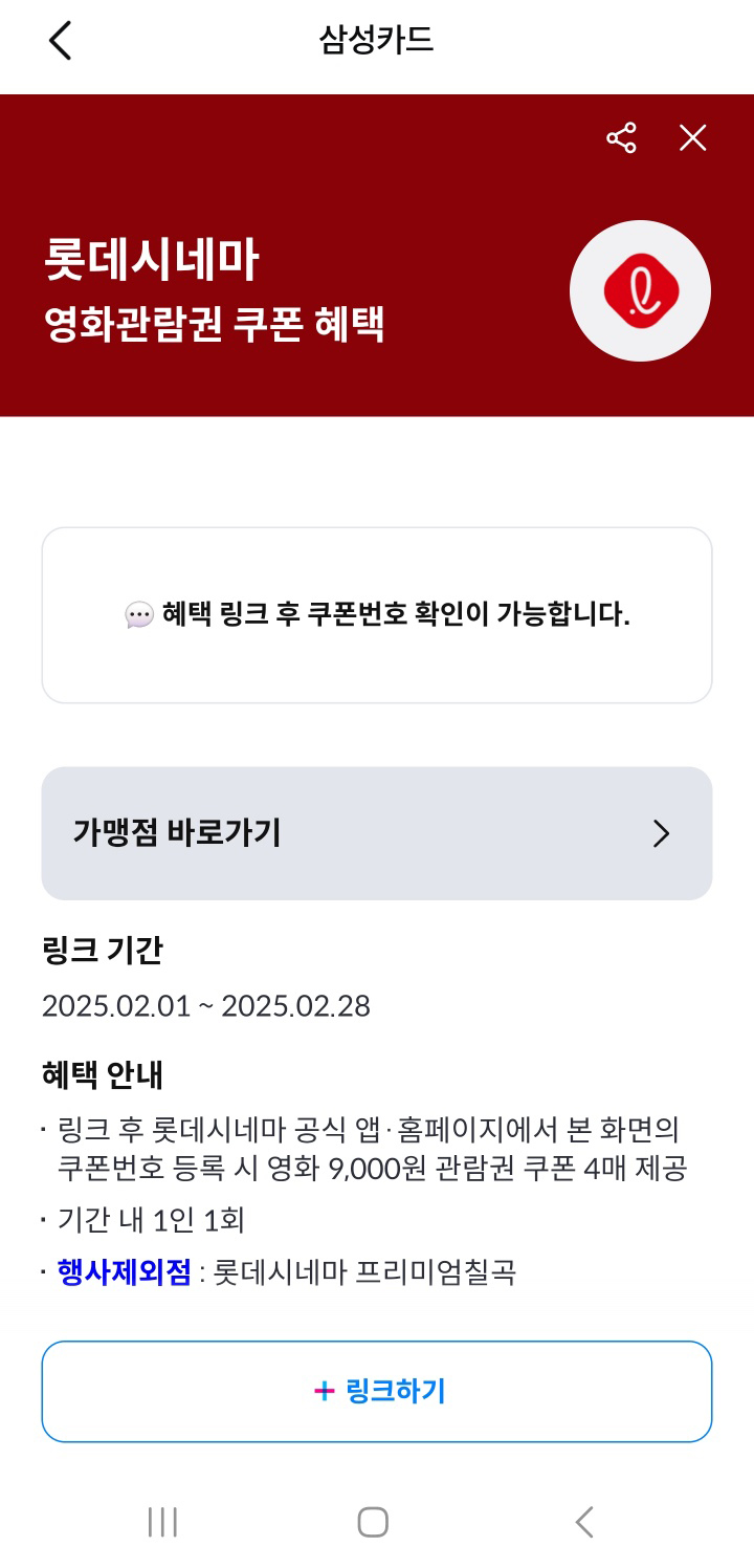 삼성카드에서 링크하신 후 롯데시네마 공식 앱이나 홈페이지에서 쿠폰번호를 등록하시면, 영화 9,000원 관람권 쿠폰을 4매 제공합니다. 기간 내 1인 1회이며, 행사제외점도 있으니 체크하시고 사용하시길 바랍니다.