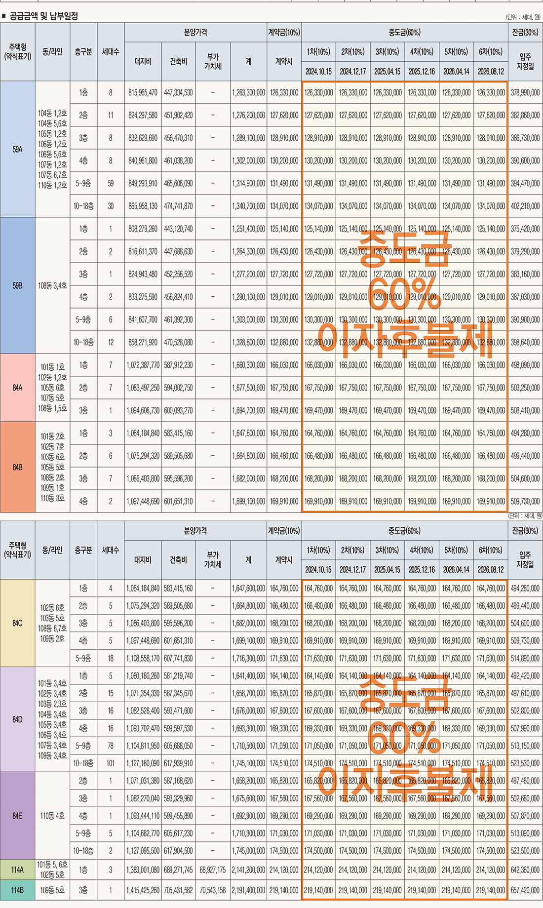 당첨자 발표일은 7월 10일, 정당계약은 21일부터 24일까지 나흘간 진행됩니다. 계약은 계약금 10%, 중도금 60% 이자후불제로 진행될 예정입니다.