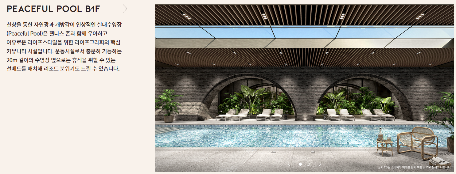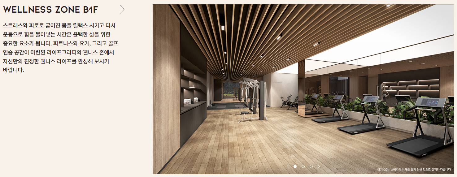 지하 1층에는 피트니스, 요가, 골프 등을 즐길 수 있는 웰니스 존과 길이 20m의 수영장을 설치했습니다.