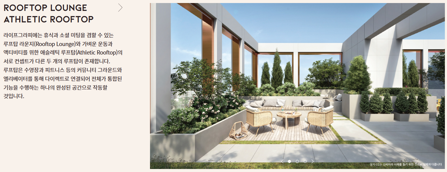 휴식과 소셜 미팅을 겸할 수 있는 '루프탑 라운지'와 가벼운 운동 및 액티비티를 위한 '애슬레틱 루프탑' 두 가지 서로 다른 컨셉의 루프탑을 설치했으며, 루프탑은 수영장과 피트니스 등의 커뮤니티 그라운드와 엘리베이터를 통해 다이렉트로 연결되어 하나의 완성된 공간으로 이용할 수 있어요.