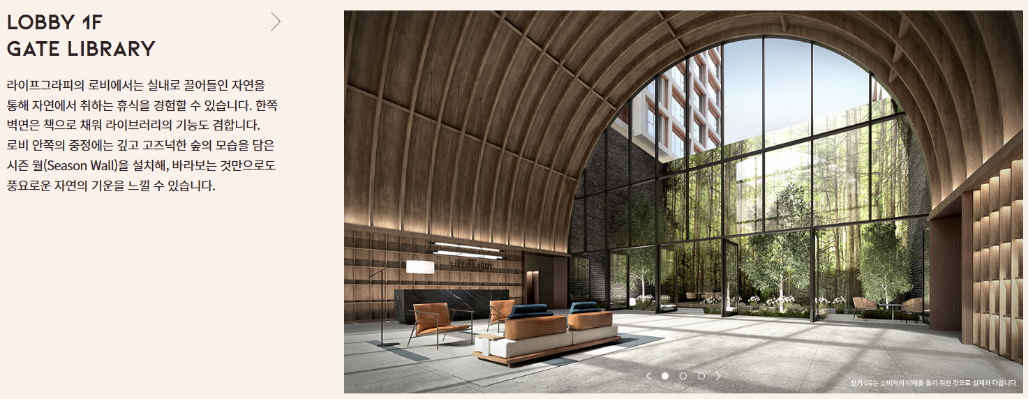 로비 1층은 한쪽 벽면을 책으로 채워 라이브러리로 이용하실 수 있으며, 단지 바깥의 공개 공지에는 8m 높이의 아치와 함께 세련된 식재를 심은 정원이 위치해요.