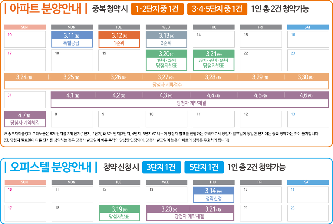 1·2단지와 3~5단지 당첨자 발표일이 하루 차이로 1인당 2번 청약이 가능하다. 아파트 청약은 오는 11일 특별공급을 시작으로 12일 1순위, 13일 2순위 청약접수가 진행된다. 당첨자 발표일은 1·2단지 20일, 3~5단지 21일이다. 당첨자 계약은 4월1일부터 7일까지다.