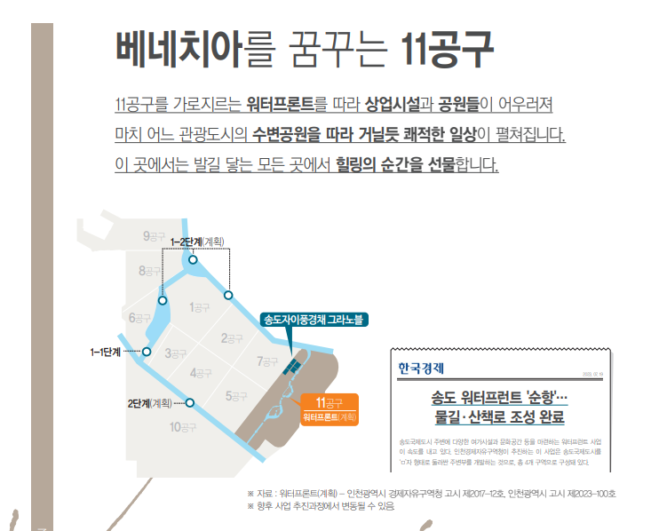 '한국의 베니스'로 개발 중인 송도 11공구는 인공수로를 따라 수변 데크와 친수 공간을 조성하는 워터프론트 계획으로 큰 주목을 받고 있는데요. 송도 11개 공구 중 가장 큰 규모로 조성되며, 도시 외곽은 바다가 감싸고 인공수로가 내부를 관통하는 구조라 대부분 지역에서 워터프론트 입지를 누릴 수 있습니다.