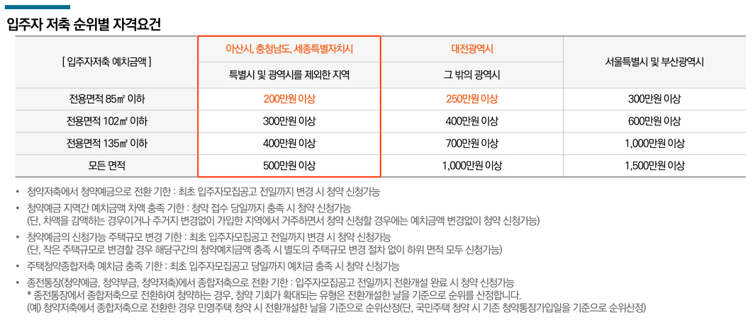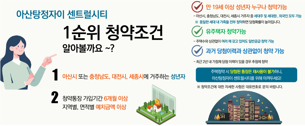 청약 자격은 모집공고일 기준 해당지역 아산시 및 충남, 대전시, 세종시 거주자 중 만 19세 이상이면서 청약통장 가입 기간 6개월 이상, 지역별·면적별 예치금 충족 시 1순위로 청약 가능하고, 주택을 보유해도 1순위 청약이 가능하며, 재당첨 제한을 적용 받지 않는다. 계약금(10%) 완납 후 즉시 전매도 가능합니다.