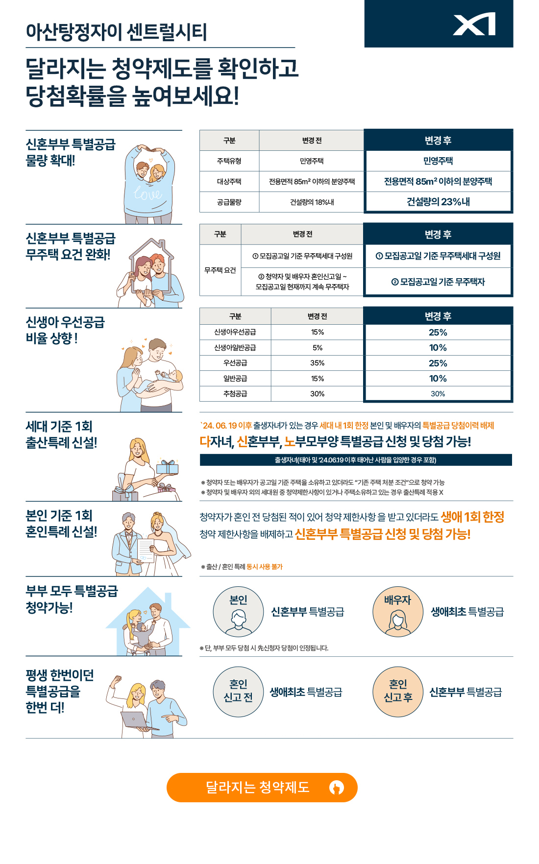변경된 청약제도도 적용되어 2024년 6월 19일 이후 출산한 자녀가 있는 가구는 앞서 한차례 특별공급을 받았더라도 신혼·다자녀·노부모부양 유형에 한해 한 번 더 특별공급 기회가 제공됩니다. 여기에 부부 모두 특별공급 청약이 가능하고(중복 당첨 시 앞선 신청자 당첨 인정), 신혼부부 특별공급은 혼인기간 내 계속 무주택세대인 경우만 가능했지만, 입주자모집공고일 현재 무주택세대구성원이면 청약 가능합니다.