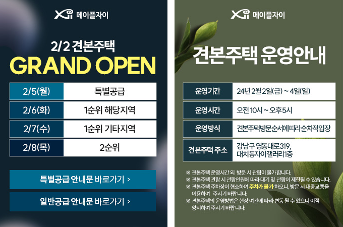 견본주택은 2월 2일부터 4일 까지 운영하며 오전 10시부터 오후 5시까지 방문순서에 따라 순차적으로 입장하실 수 있다고 합니다. 견본주택 위치는 강남구 영동대로319, 대치동자이갤러리1층입니다.