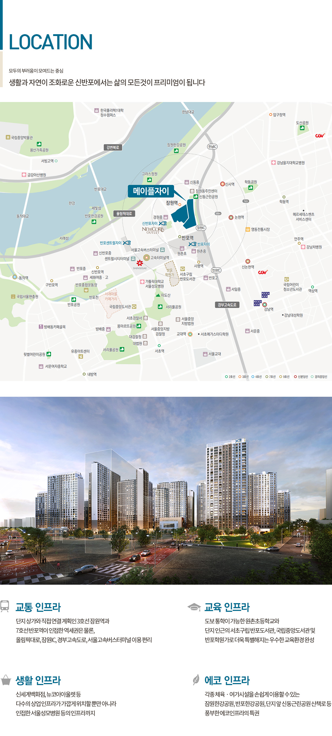 단지 상가와 직접 연결 계획되어 있는 3호선 잠원역과 7호선 반포역이 인접해 있는 역세권 단지이며, 인근에 올림픽대로, 잠원IC, 경부고속도로, 서울고속버스터미널 등의 이용이 편리한 교통 인프라를 갖추고 있습니다.