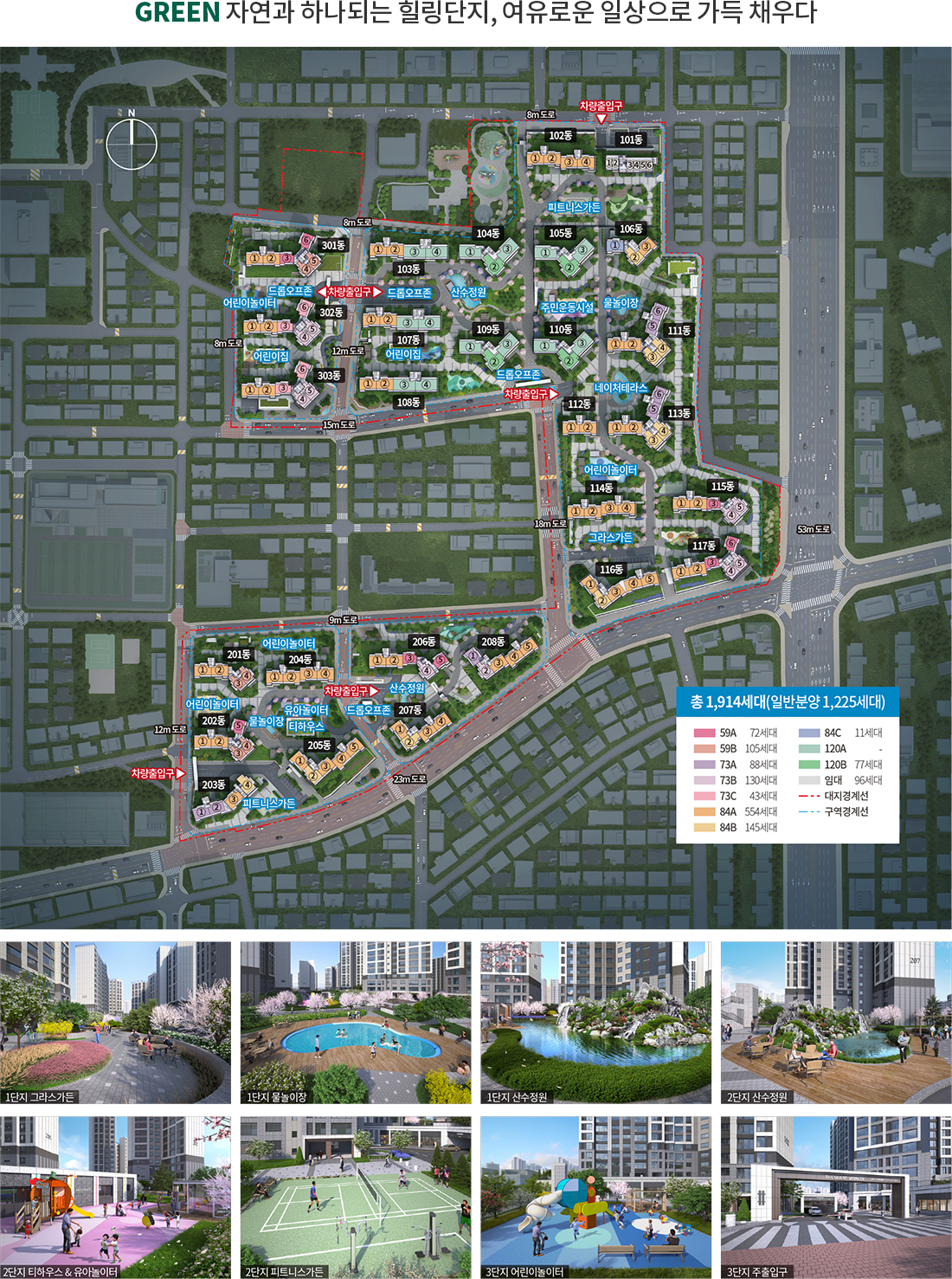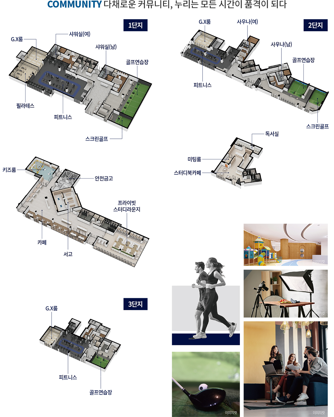 커뮤니티 시설은 실내러닝트랙과 GX룸을 갖춘 피트니스센터를 비롯해 실내골프연습장, 작은도서관·키즈룸·스튜디오 등의 원스톱 문화공간 카페, 스터디북카페, 프리미엄 안심보관센터 등 단지별로 다채로운 커뮤니티 시설이 들어설 예정입니다.