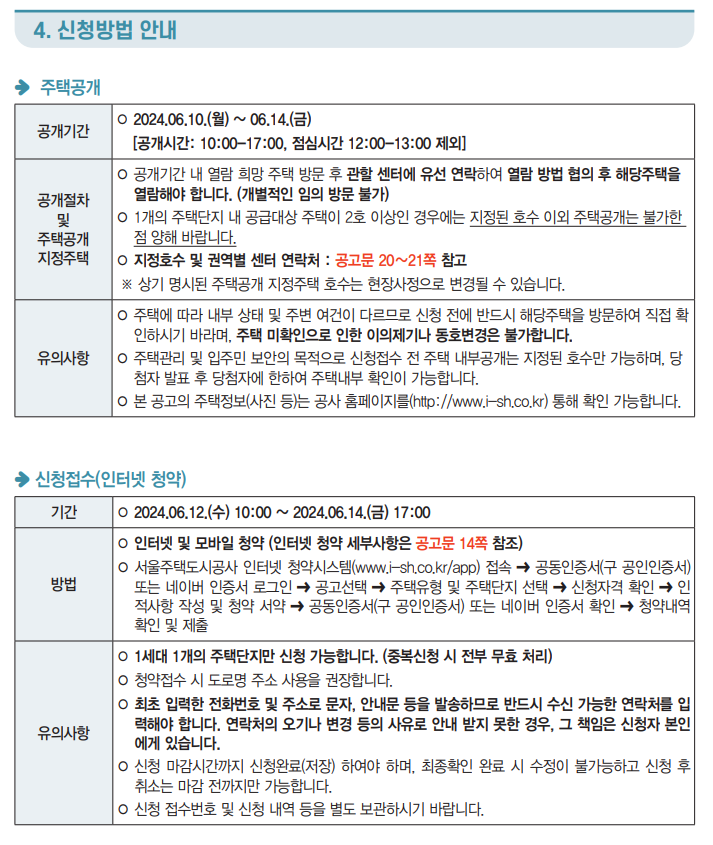 - 주택공개(현장방문) : 2024.06.10.(월) ~ 2024.06.14.(금) 10:00~17:00 ※ 기간 내 단지별로 지정된 1개의 호실만 공개(임의 방문 불가)