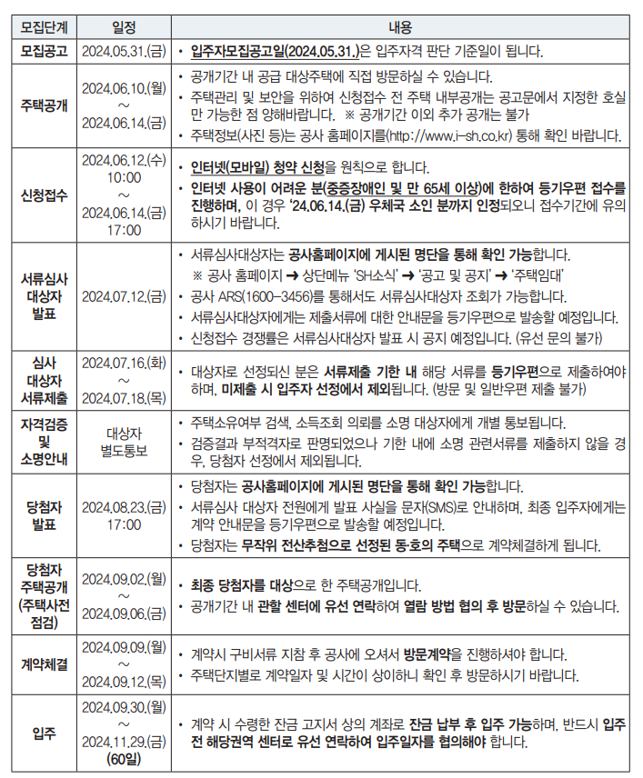 2024년 장기미임대 매입임대주택 주택공개 및 신청접수 일정