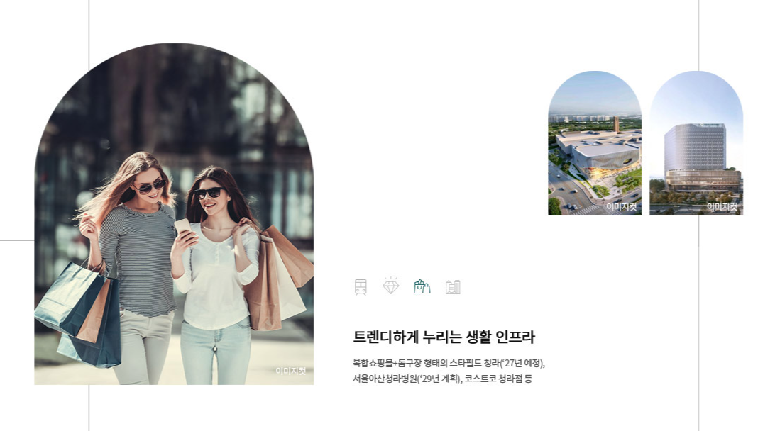 하나드림타운(26년 예정), 인천로봇랜드(27년 예정), 카이스트 및 하버드의대 연구소가 입주 예정인 의료복합타운(29년 계획), 영상문화복합단지(29년 계획), 청라시티타워(30년 계획) 등을 비롯해 차로 10분 거리에 국내 최대 규모 코스트코 청라점과 돔구장이 함께 들어서는 대형 복합문화쇼핑몰인 스타필드 청라가 2027년 들어설 예정이고, 서울아산청라병원은 2029년으로 예정돼 있습니다.